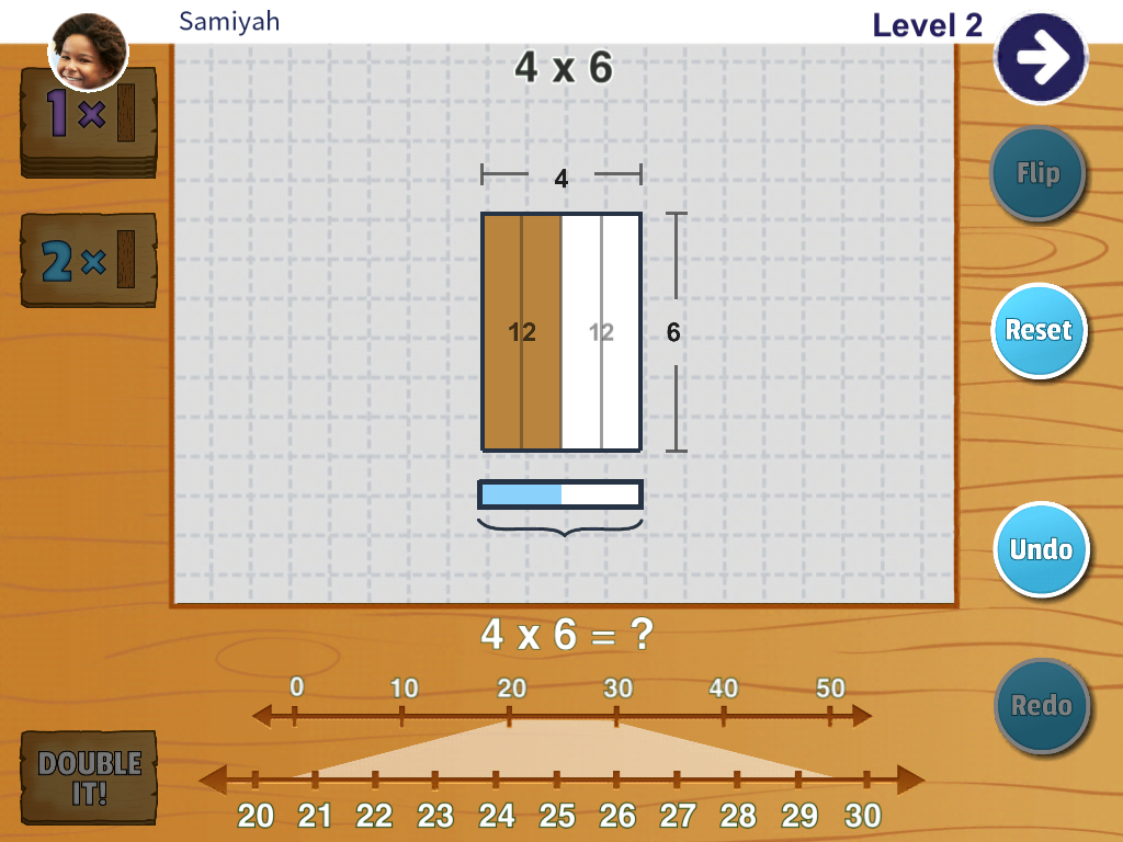 Another third grader was working through several 4 x __ problems. She would consistently drag out 2 planks and then use the Double-It card to make another set of 2 planks. She first saw the problem 4 x 6, dragged out 2 six-planks to make 12 then used the Double-It card to make another group of 12. She did not fully trust that the answer was actually going to be 24, but she entered it in anyway and was surprised when it was correct.