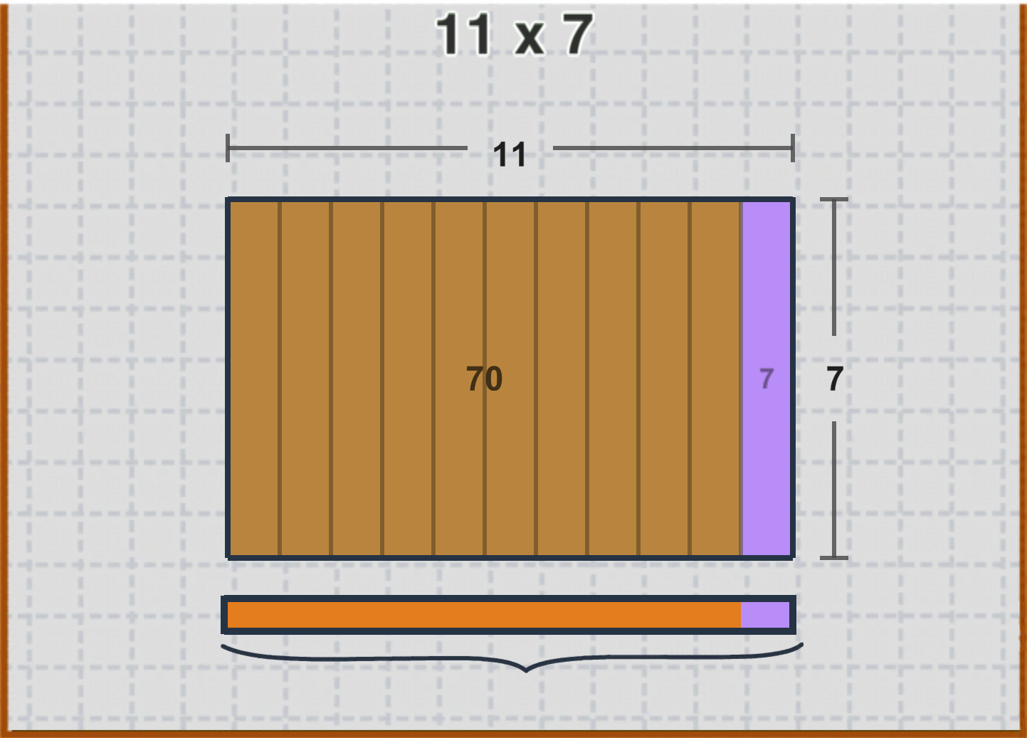 In Mt. Multiplis students explore this property by using groups of wooden planks to build bridges. To fill a 7 by 8 area, students drag over 5 planks of 8 and then drag over another 2 planks of 8.